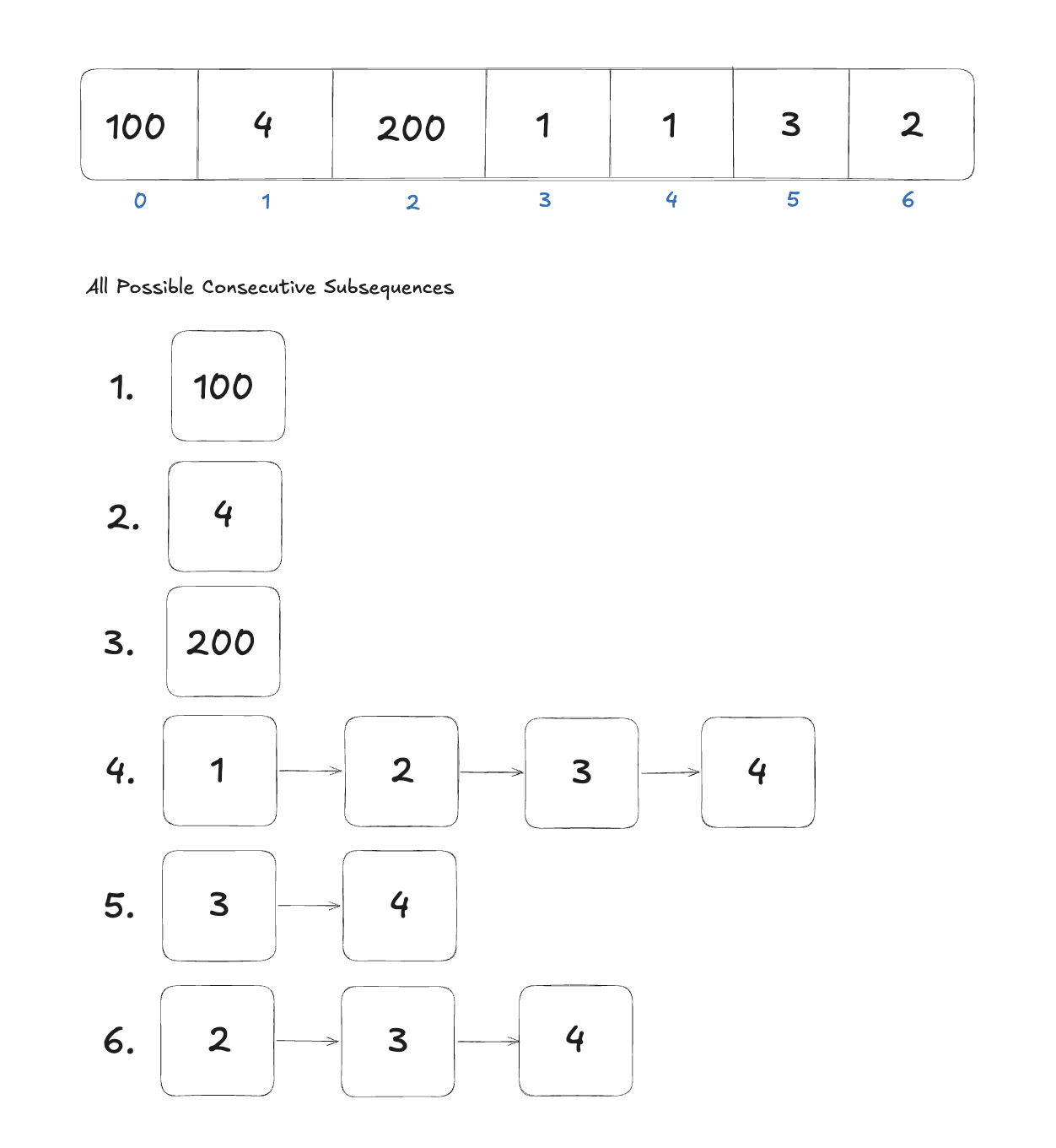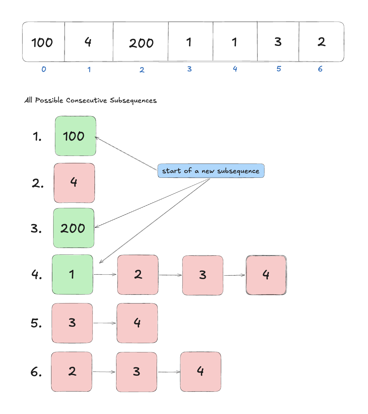 Every element in nums can either be start of a new consecutive subsequence or part of an